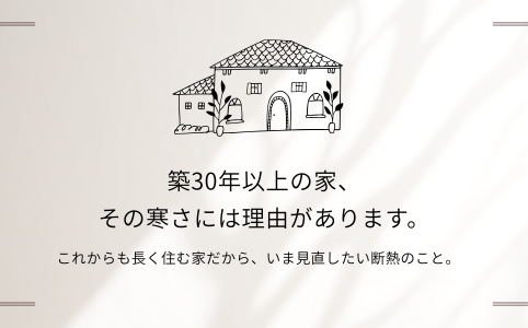築30年以上の家に住んでいて、 こんな悩みはありませんか? 実は、築30年以上の住宅の多くは、現在の基準と比べると断熱性能が十分でないケースが少なくありません。そのため、適切な対策を行わないと、快適性が損なわれたり、光熱...